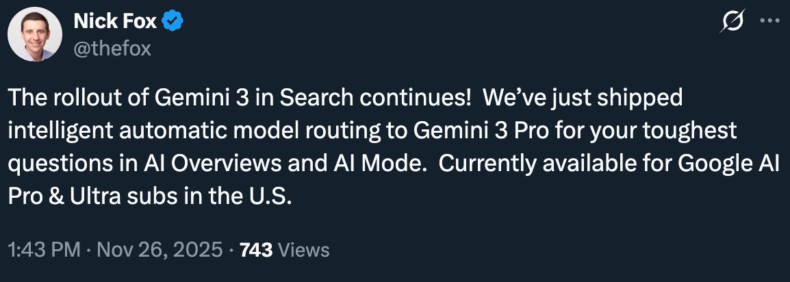 I know Google said on November 18th that Gemini 3 was "shipping in Search on day one." But no, it shipped on November 26th instead. Nick Fox, SVP at Google, said on X, "We’ve just shipped intelligent automatic model routing to Gemini 3 Pro for your toughest questions in AI Mode."
