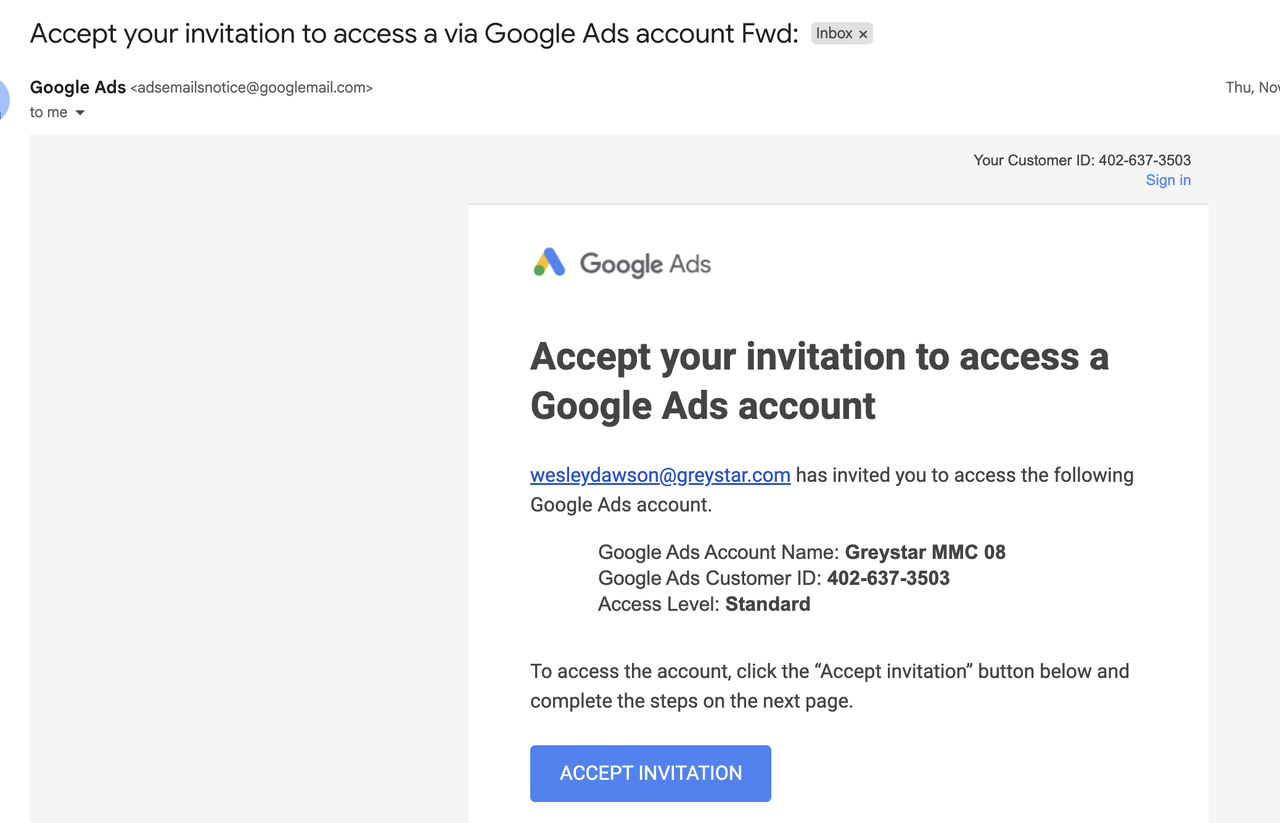 See the email address? Looks like access is sent from Google, but it's notIf your team had asked for access from someone who was reaching out to you to audit their account, and they sent you something like this, when you click "accept," it goes to the "continue page" that looks ecatctly like google's, but has a different URL - you click continue and then it asks you to log in to your google account(even tho you're logged in) - you enter the credentials of the account you have access to your MCC and then there you go if you did they now received your credentials (but you are saying you had 2-step, so not sure).