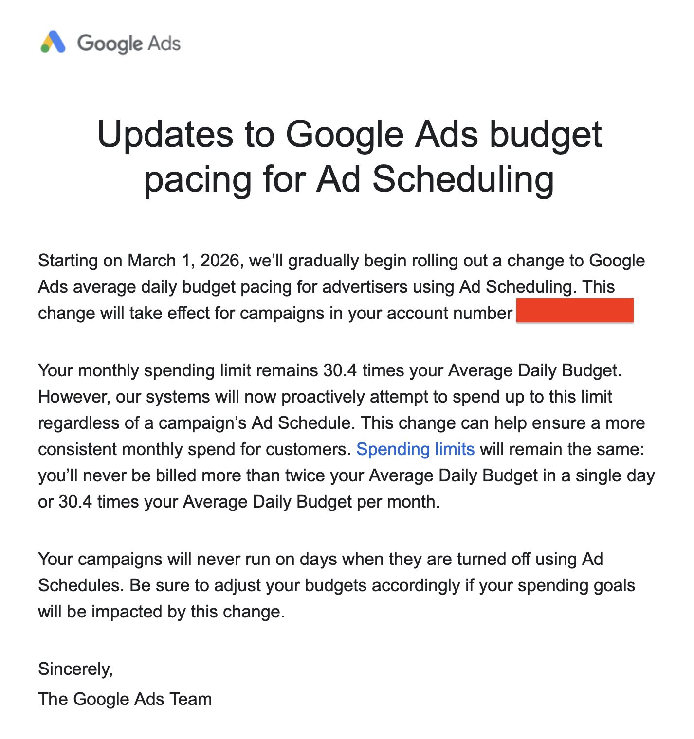 Google sent out an email to some Google Ads advertisers about changes coming to Google Ads budget pacing for ad scheduling. These changes go into effect on March 1, 2026.