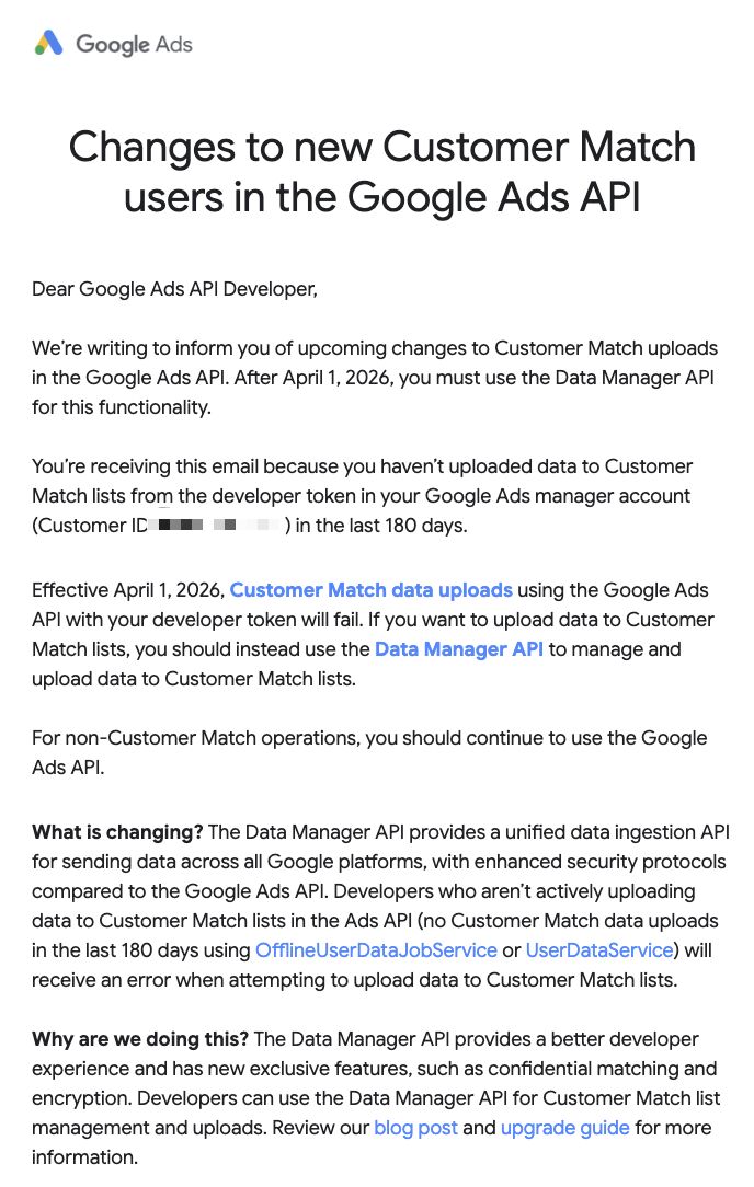 We're writing to inform you of upcoming changes to Customer Match uploads in the Google Ads API. After April 1, 2026, you must use the Data Manager AP! for this functionality.You're receiving this email because you haven't uploaded data to Customer Match lists from the developer token in your Google Ads manager account (Customer ID ###) in the last 180 days.