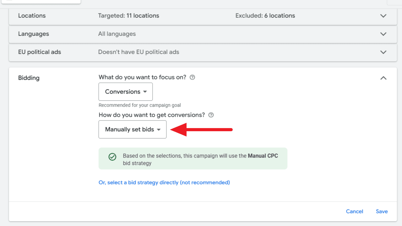 Google Ads has reportedly streamlined the selection capability of Manual CPC bidding during the campaign setup. Now the option can be found under the "Conversions" goal, labeled as "Manually set bids."