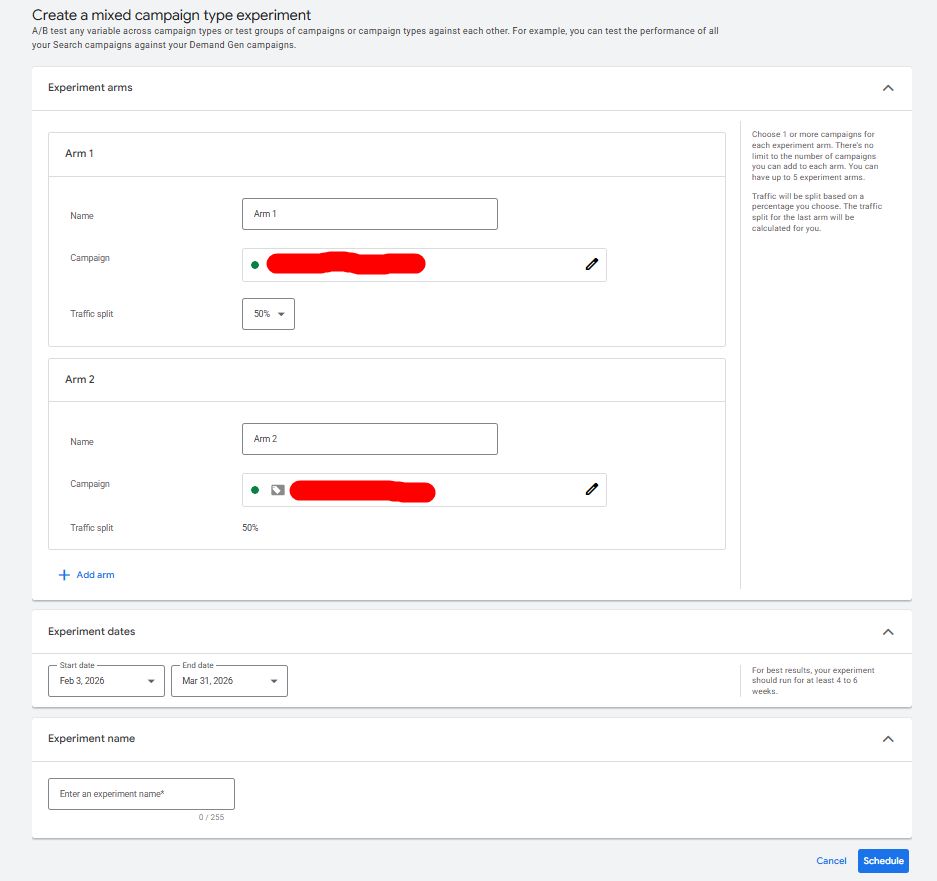 The Google Ads mixed campaign type experiment beta, which we covered the help document last month, seems to be going live for some advertisers. This feature allows advertisers to test multiple campaign types, budgets, and settings across campaigns in a single experiment.