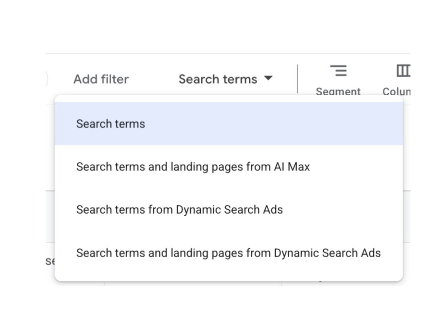 The Search terms report within Google Ads has this quick dropdown filter that lets you filter by search terms, search terms and landing pages from AI Max, search terms from Dynamic Search Ads and search terms and landing pages from Dynamic Search Ads.