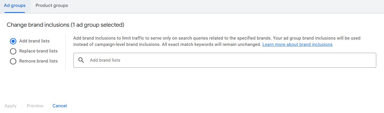 To access this feature, go to the ad group level of the shopping campaign and edit the specific ad group to add your brand list.