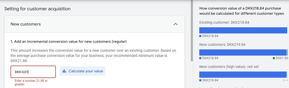 This guidance is part of an experiment aimed at helping advertisers use settings that will improve results—specifically, to increase new customer ratios—when setting New Customer Value within New Customer Acquisition campaigns.When the New Customer Value is set too low, or not set at all, it prevents the campaign from properly optimizing to find high-value new customers.