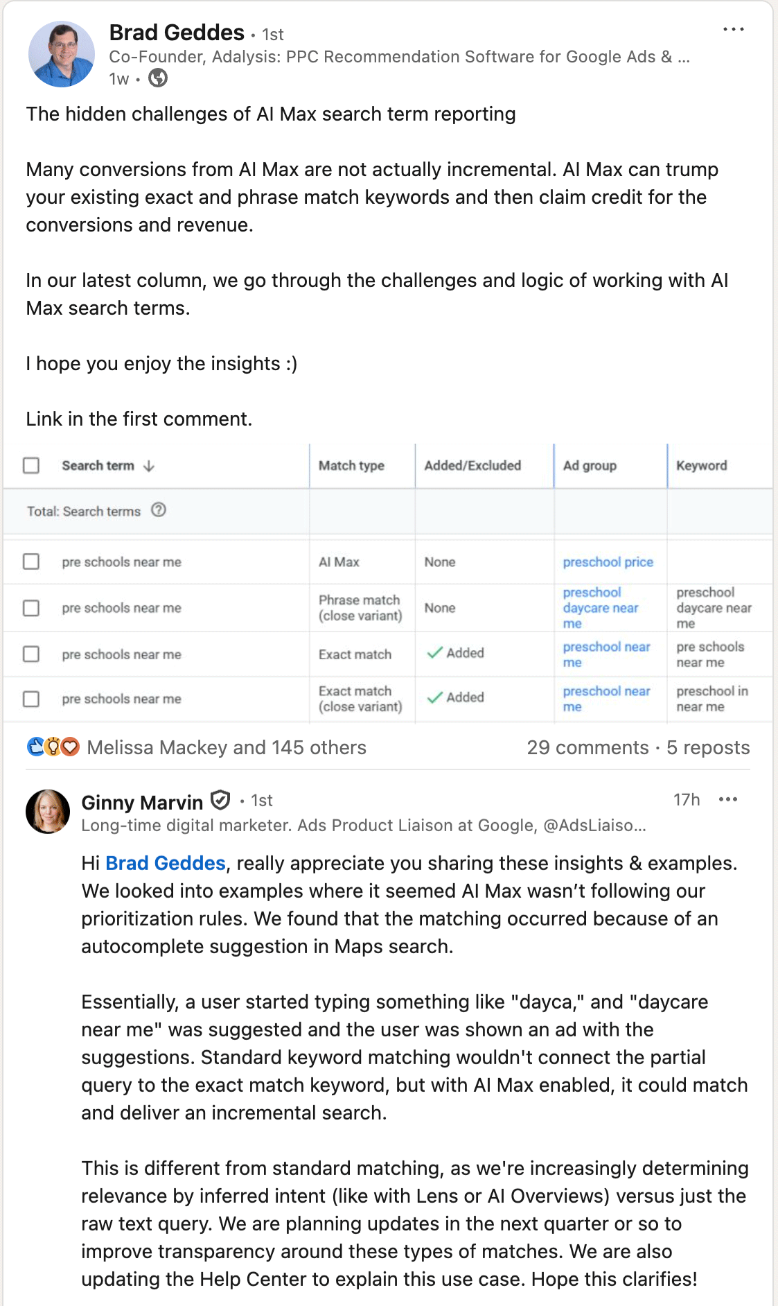 Ginny Marvin from Google responded on LinkedIn to explain where this exactly came from, which is super transparent and makes AI Max easier to understand. Here is what she wrote: