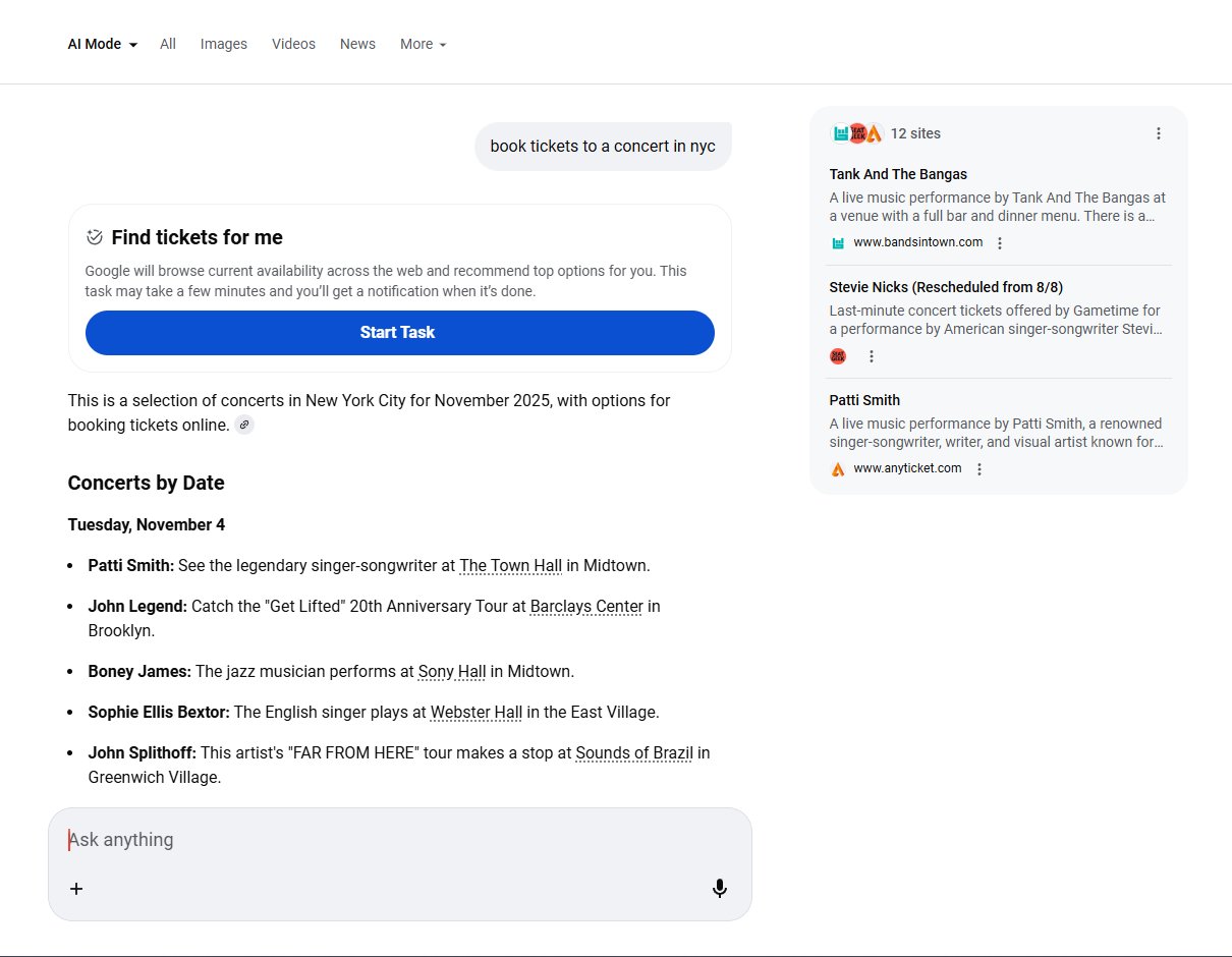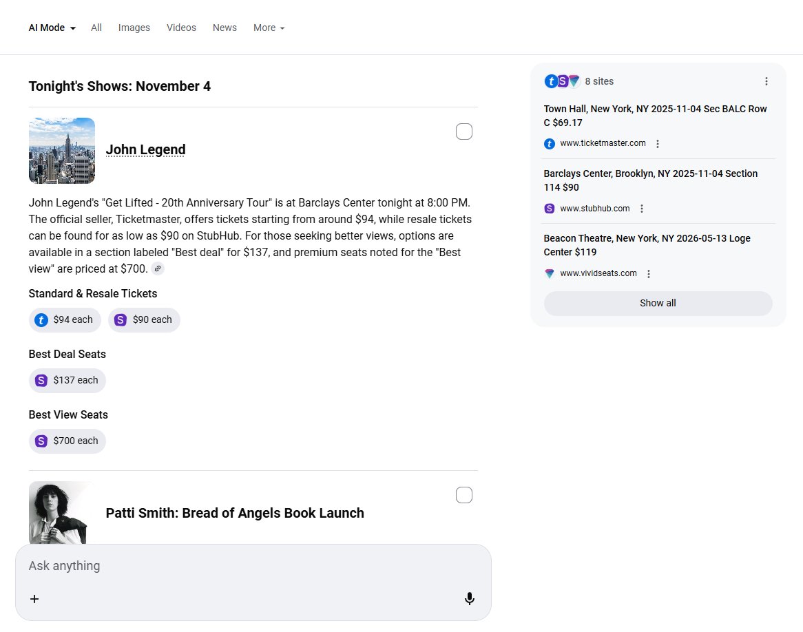 Glenn Gabe played with it and shared screenshots on X - Glenn also wrote, "I asked AI Mode to help with finding concert tickets in NYC. It took about 8-10 minutes to research and then provided the concerts with pricing and links to buy those tickets across platforms like Ticketmaster and StubHub."