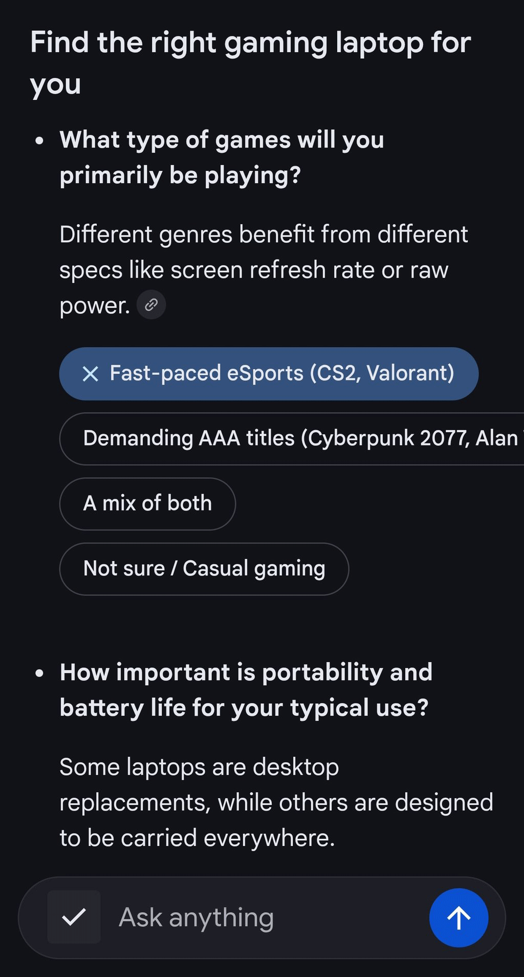 You can see, Google AI Mode is asking the user "What type of games will you primarily be playing?" And then gives four different options to pick from.