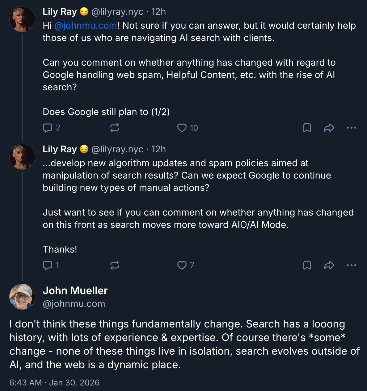 Can you comment on whether anything has changed with regard to Google handling web spam, Helpful Content, etc. with the rise of AI search?Does Google still plan to develop new algorithm updates and spam policies aimed at manipulation of search results? Can we expect Google to continue building new types of manual actions?
