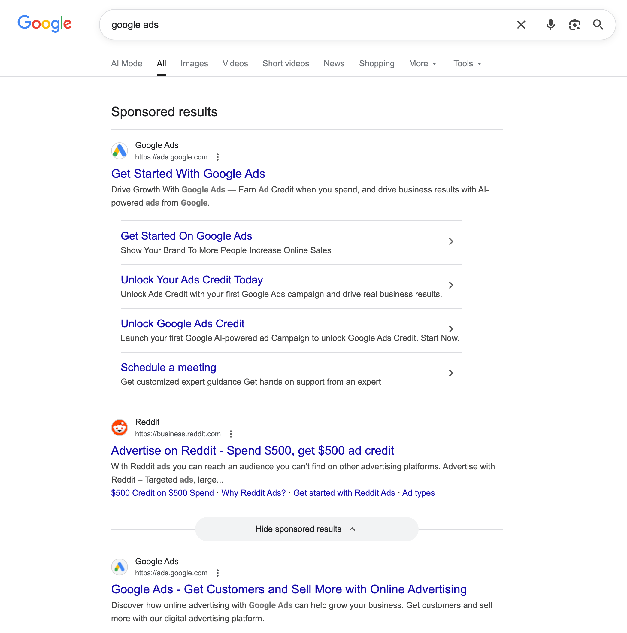 Text ads on the search results page will now be grouped with a single “Sponsored results” label. This new, larger label stays visible as people scroll, making it clear which results are sponsored — upholding our industry-leading standards for ad label prominence. We’re also adding a new “Hide sponsored results” control that allows you to collapse text ads with a single click if you want to focus only on organic results. In our testing, we found that the new design helps people navigate the top of the page more easily. The new design keeps the size of ads the same and you’ll still never see more than four text ads in a grouping.The new “Sponsored” label also applies to other ad units on the search results page, like Shopping ads. These updates are currently rolling out globally on desktop and mobile.
