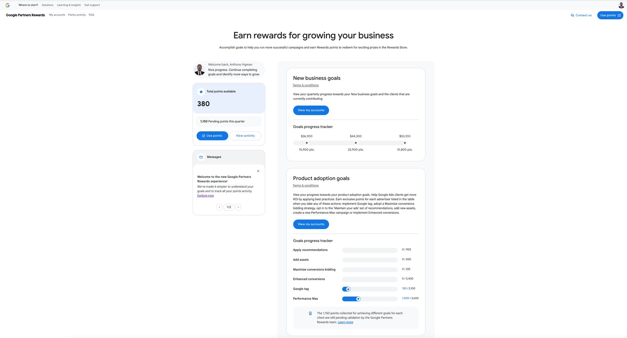 Welcome to the new Google Partners Rewards experience!We've made it simpler to understand your goals and to track all your points activity.