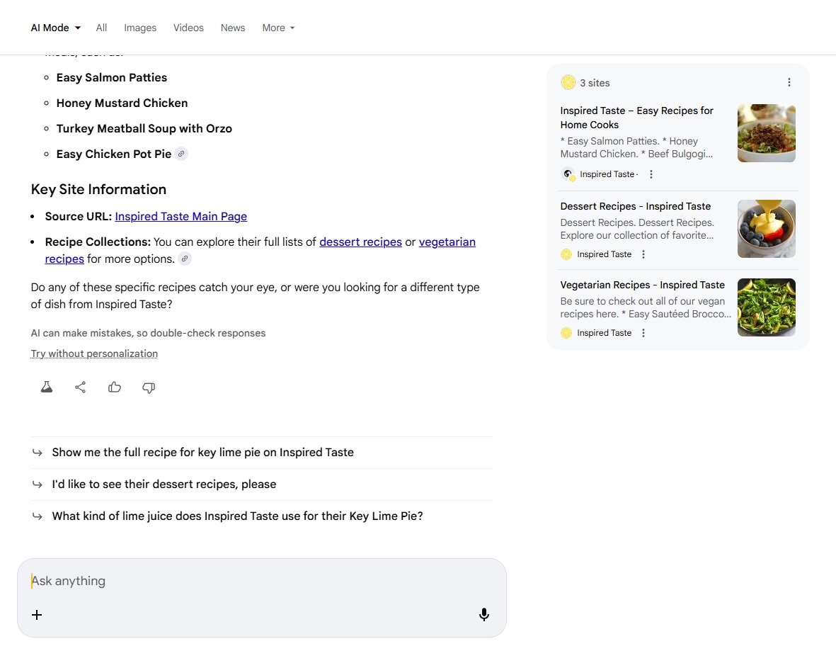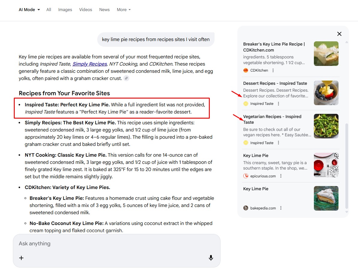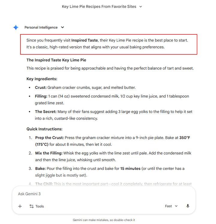 Glenn Gabe posted a super useful deep dive into how Personal Intelligence works for him and within there, he asked for a Key Lime Pie recipe. So Google knows he visited Inspired Taste a lot, recently, and used that site to provide him a recipe. I should note, that Personal Intelligence is incredibly cool to me, futuristic if you will. If you go through Glenn's post, you will often say, "wow, it did that." But because of how cool and smart it acts, you might trust it more.