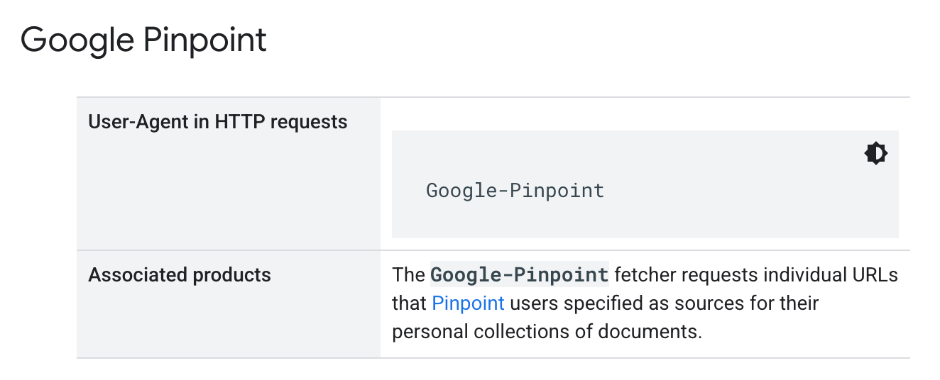 Google has documented a new user agent, a user-triggered fetcher, named Google-Pinpoint. "The Google-Pinpoint fetcher requests individual URLs that Pinpoint users specified as sources for their personal collections of documents," Google posted in its updated documentation.