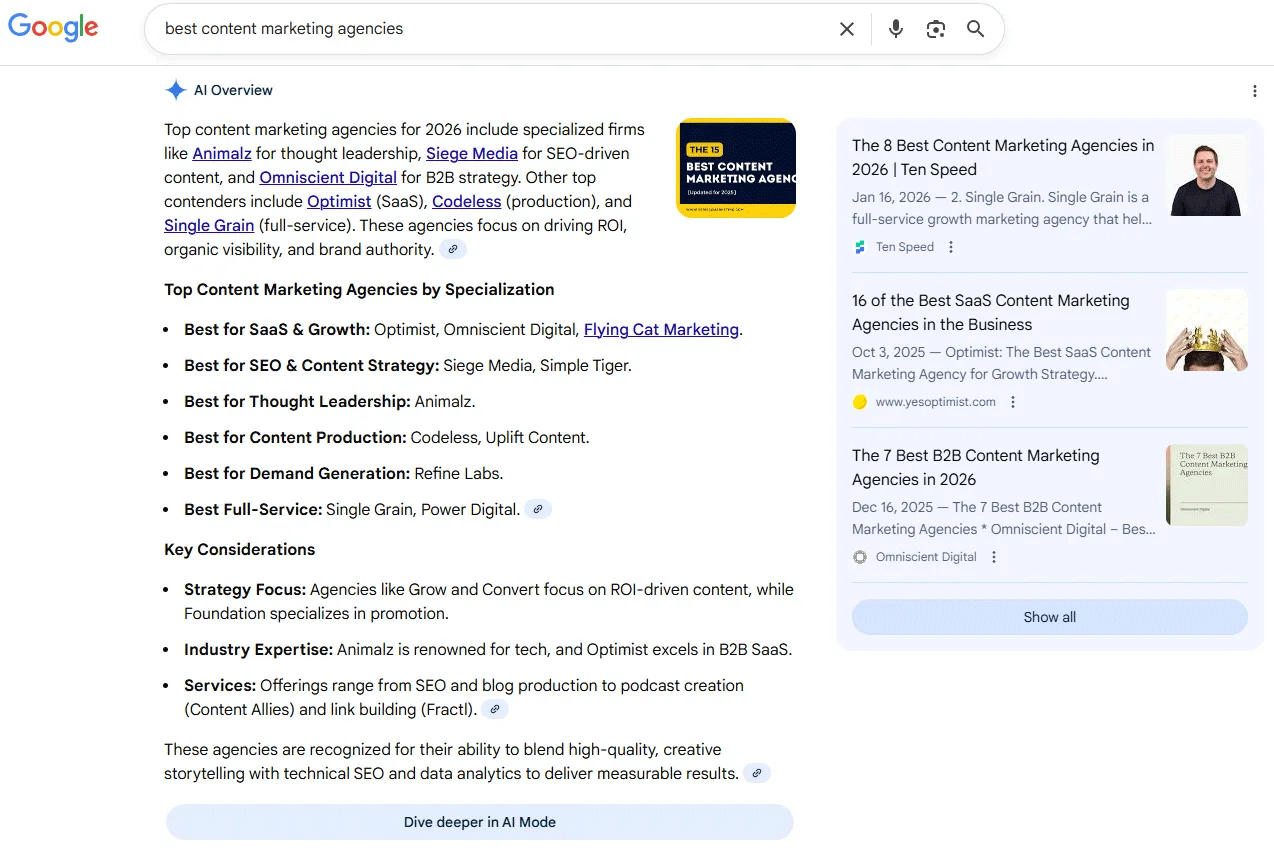 But try it yourself, let's say for [best seo agency] in AI Mode and you get this page ranking in those responses. They list their own agency followed by others. It is these self-promotional listicles that were the "hack" to do well here for a while now and supposedly, a lot of these are not ranking anymore in Google.