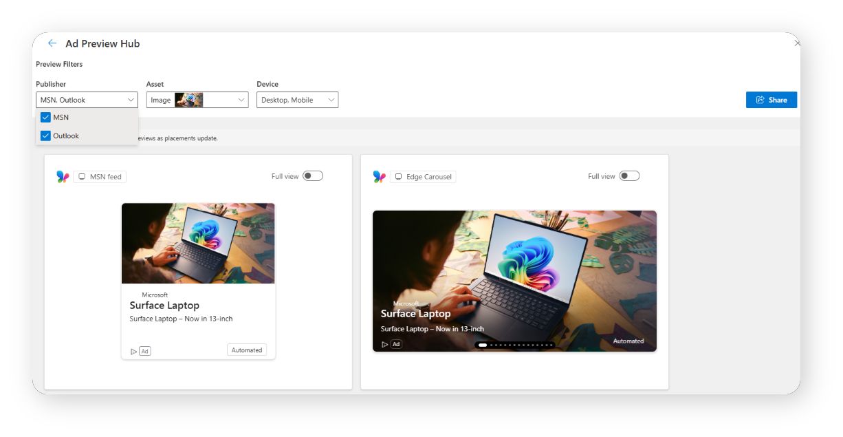 2. Once you're in the Ad Preview Hub, you can see all ad formats for supported publishers (as of now MSN and Outlook), devices, and asset types.