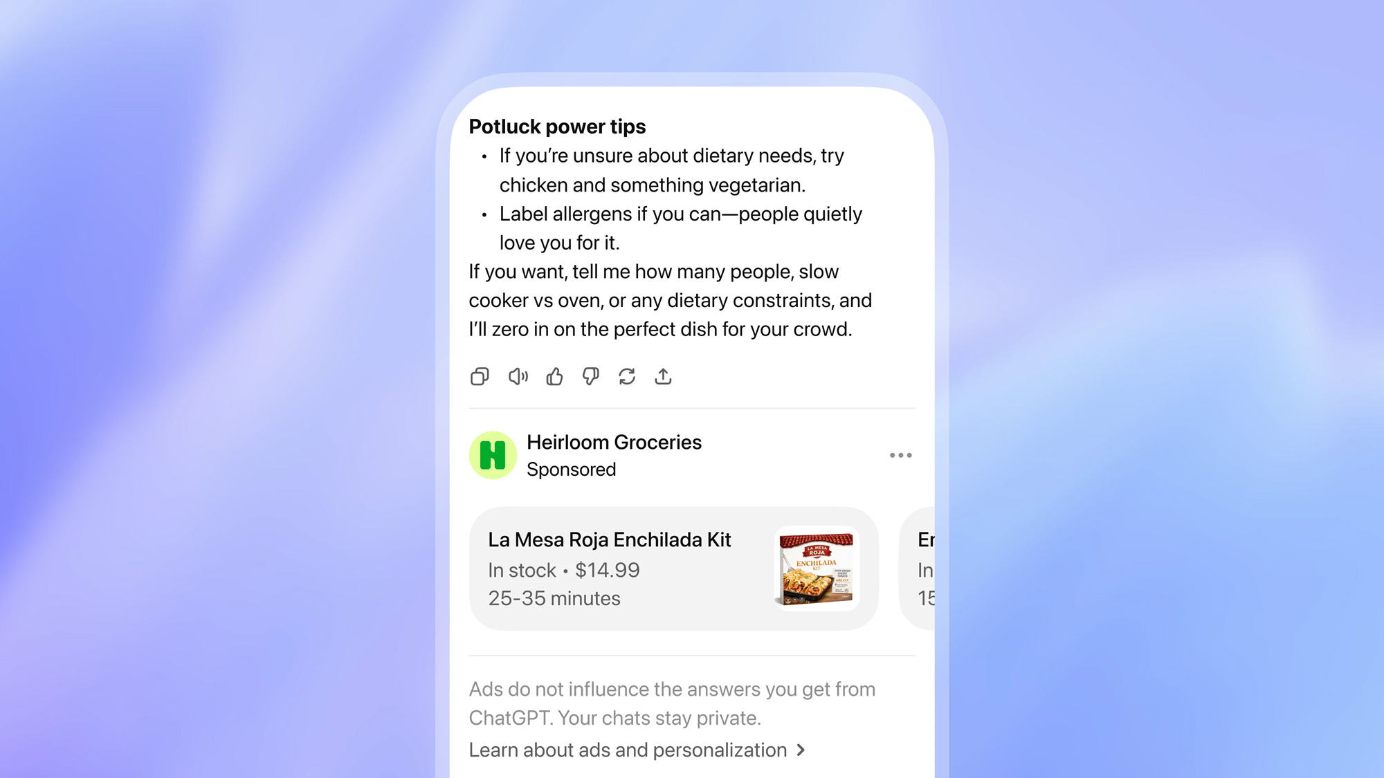 OpenAI wrote, "You can control the ads you see in ChatGPT, including dismissing ads, sharing feedback, learning how and why you’re being shown a particular ad, deleting your ad data with one tap, and managing ad personalization at any time."
