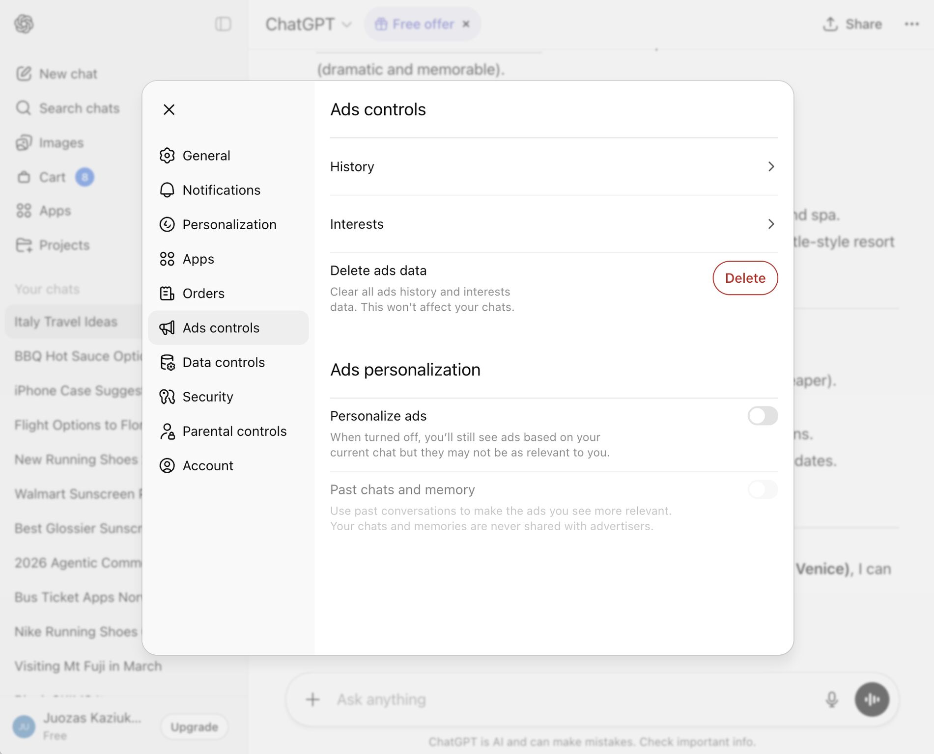 - Ads can be further personalized through memory "Use past conversations to make the ads you see more relevant. Your chats and memories are never shared with advertisers." Mine is greyed-out because I have memory disabled on the account.