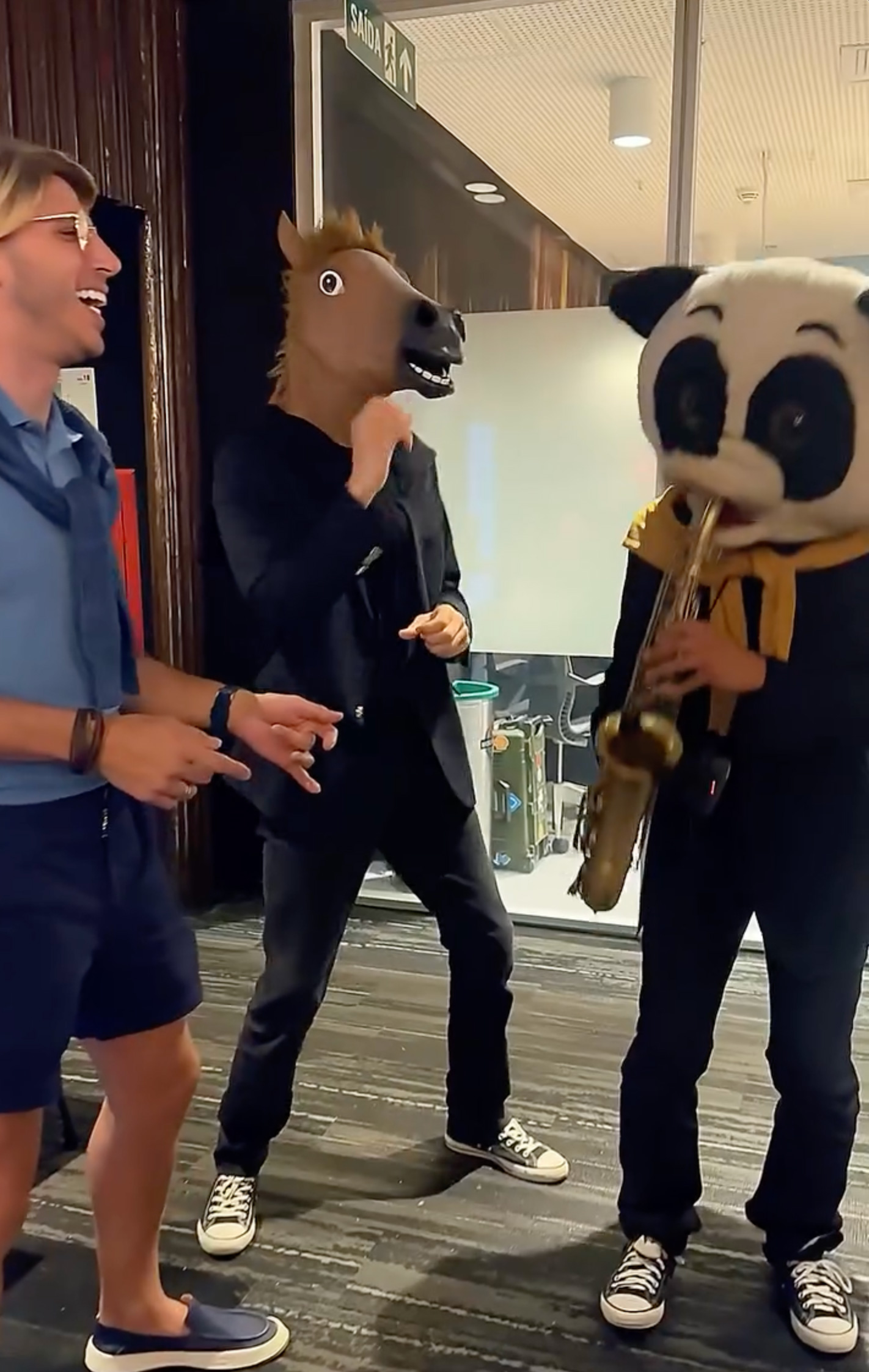 I am really not sure what is going on here but here are some folks dressed up as animals, a horse and panda bear, playing music at the Google office.