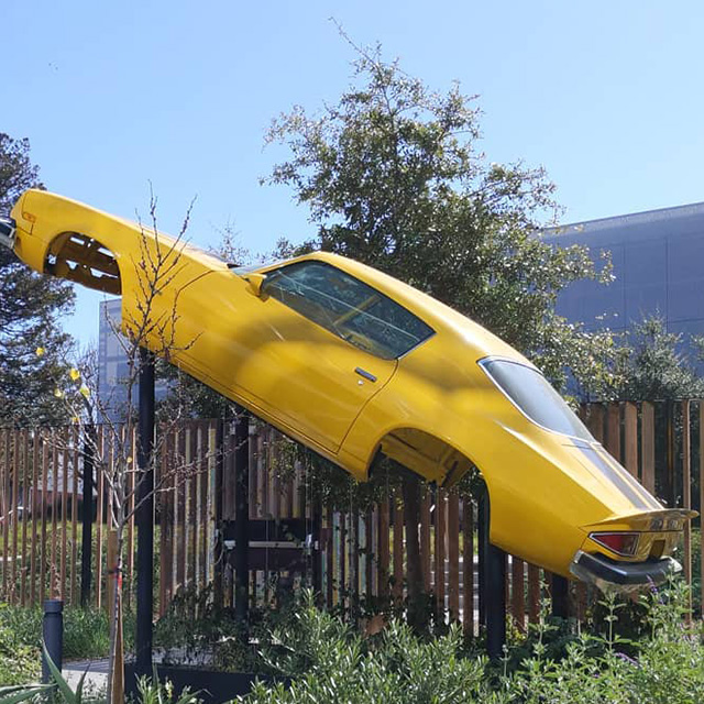 I am not sure what this is about. Maybe it is an art project of some kind. But I found this photo of a car body frame suspended in air near the Google offices, the GooglePlex, in Mountain View, California.