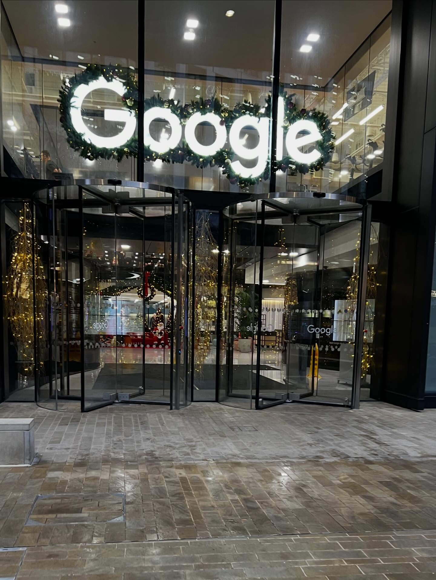 The entrance to the Google London office is ready for the holidays. You can see the signage is all dressed up for the holidays. And in some of the videos on Instagram, as you walk in, the lobby is all decked out as well.