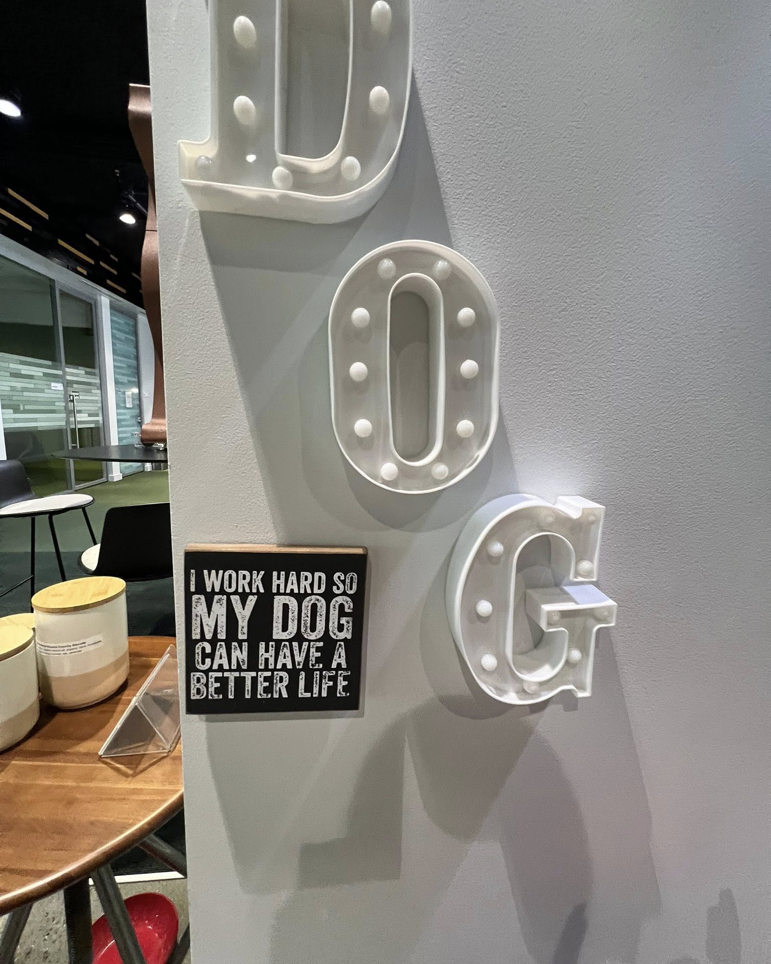 There is this corner at Google office in Kirkland, Seattle that has a sign for dogs, Dooglers, and there is another sign that says, "I Work Hard So My Dog Can Have A Better Life."
