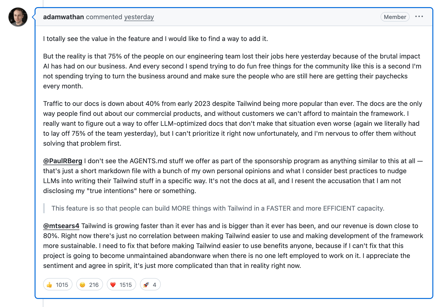 Adam Wathan the creator of Tailwind CSS posted that he had to let go of 75% (from 4 people now down to 1) of his engineering team because of AI. He said traffic to the Tailwind help documentation is down 40% and that is where most people learn about his solution and then buy commercial products. He added his revenue is down 80%.